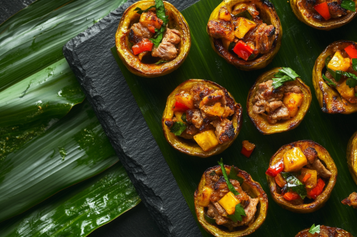 STYLE: Close-up Shot Top view | EMOTION: Tempting I SCENE: Stuffed plantain cups Mini plantain cups filled with meat and vegetables, arranged on a green leaf-lined black slate platter. Food photography, highly detailed, close-up shot, macro lens. | TAGS: High-end food photography, clean composition, dramatic lighting, luxurious, elegant, mouth-watering, indulgent, gourmet | CAMERA: Nikon Z7 | FOCAL LENGTH: 50mm | SHOT TYPE: Close-up | COMPOSITION: Top view Centered | LIGHTING: Soft directional light | PRODUCTION: Food Stylist --ar 3:2