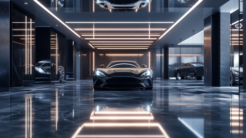 photo reallistic futuristic concept car show room modern sleek --ar 5:4 --v 6.0