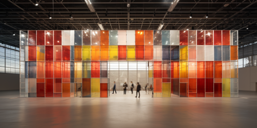 Hyperrealistic photo, Interior view, 65mm focal length, a pavilion that works as a workshop and a showroom made from large format ceramic tiles of a wide variety of colors, inspired in the Barcelona Pavillion by Mies Van DerRohe, it is a rectangular space of 40 meters long, inside of an industrial warehouse, it is made with modular systems and filled with different equipment like drills, circular saws, reciprocating saws, grinders, jackhammers, and aulas for training, the space is filled with warm lighting --ar 4:2