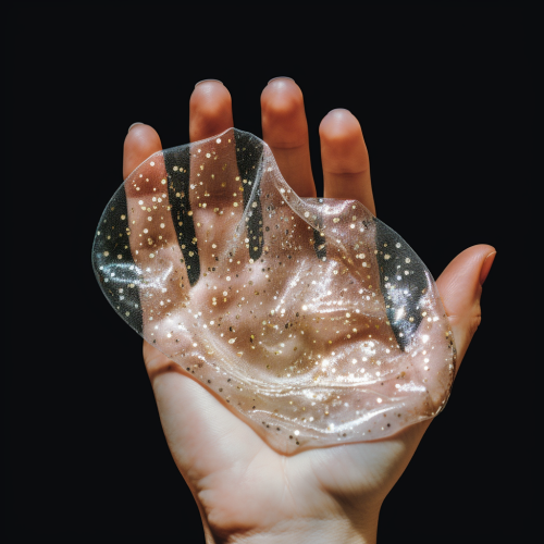 a hand holding a cosmetic sheet mask, coverd in glitter and sparkling dots, raw, realistic, photography
