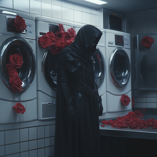 a reaper standing in a laundry room filled with laundry machines that have roses coming out of them. A black bottle sitting on the counter top, photo realistic