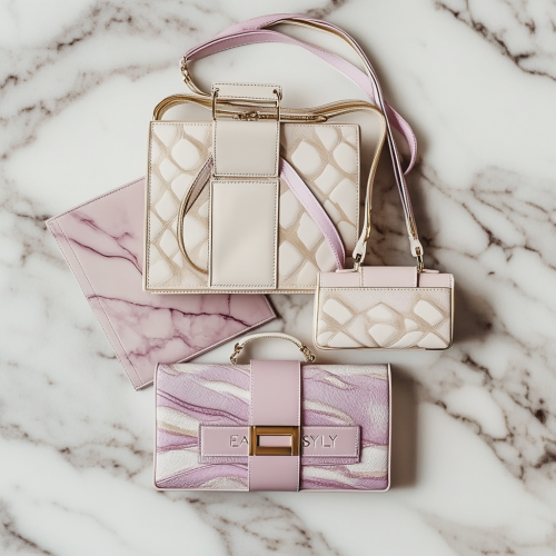 "An Instagram post showcasing luxurious boutique bags designed by a high-end design company. The post features a flat lay of three stylish bags arranged on a marble surface, with delicate gold accents and intricate patterns. The bags are in soft, pastel tones like blush pink, cream, and lavender, exuding elegance and sophistication. The post includes a chic font overlay with the text, 'Elevate Your Style.' The company’s logo is elegantly placed in the bottom corner, with subtle shadows and a warm, inviting filter that enhances the luxurious feel of the products.