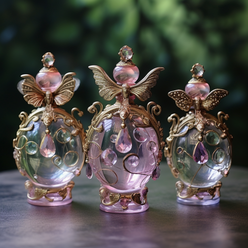 Luxurious fragrance scene with elegant vintage perfume bottles.