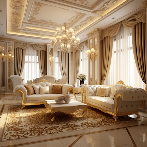 luxury lightclour golden color familyroom white curtain sofa and furniture carpet