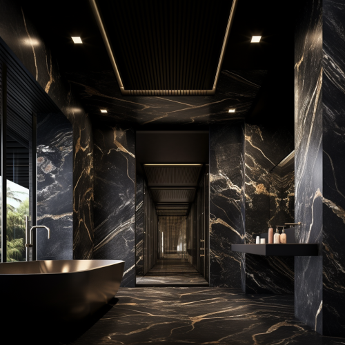 wide 3d photograph of black marble wall and floor with slight white texture display studio, camera set to be 45-60 degree angle shooting on the floor from the top, single light source from the top, super dark tone, luxury feeling, --ar 2:3 --v 6.0