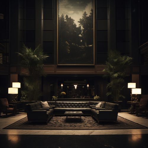 aman hotel lounge, hyper realism, minimal, dark, quiet quality, art, craft