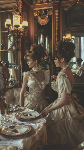 An intimate setting within Mahogany Hall, perhaps a luxuriously appointed room, where these women would entertain clients. The photo should capture the essence of the era and the unique service offered, looking like an authentic image. --v 6.0 --ar 9:16