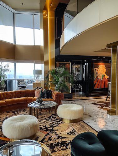 Design an opulent living room that reflects the grandeur of the mansion's classic yet luxurious facade. The room should feature soaring ceilings with ornate molding, meticulously designed to match the classical columns seen on the exterior. Massive arched windows dominate the space, allowing abundant natural light to flow in, framed by rich, heavy curtains in a plush velvet material, with gold tiebacks to complement the mansion's regal accents. The flooring is made of polished marble, with intricate mosaic designs around the perimeter, seamlessly blending with a custom wool rug that stretches across the seating area. The centerpiece of the room is a grand crystal chandelier, cascading light onto the space and reflecting off the glossy surfaces below. The furniture should include an oversized sectional sofa in a soft beige leather, accented by golden and deep emerald throw pillows, providing a subtle touch of modern luxury. The coffee table is a masterpiece of marble and gold trim, matching the tones of the room. Near the fireplace--framed in dark marble and accented with classic stone details--a pair of plush armchairs offer a cozy reading nook, with a view of the sculpted garden through the large windows. On the walls, large art pieces in gilded frames evoke a sense of timeless sophistication, while contemporary sculptures add a modern flair, balancing tradition with the present. Modern technology is discreetly integrated into the room, with a hidden flat-screen TV and a built-in surround sound system for an immersive experience without detracting from the room's elegance. Warm lighting is strategically placed to enhance the textures and tones of the room, from golden wall sconces to soft ambient light reflecting off the marble floor