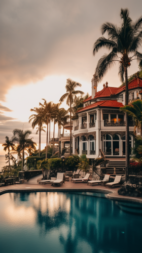 Design a luxurious outdoor space at the back of a modern island mansion, featuring an infinity pool that seamlessly blends into the ocean view, with a sophisticated lounge area and exclusive entertainment zone. The area should feel secluded, offering the utmost privacy and comfort, while still maintaining an open connection to the breathtaking island environment. The centerpiece of the space is a large infinity pool, with glass edges that create the illusion of the water extending into the horizon. The pool is surrounded by polished limestone decking, creating a bright, elegant contrast with the blue of the water. Along the edge of the pool, sleek built-in underwater lighting adds a magical ambiance, illuminating the water with soft, glowing light as evening falls. At one end of the pool, a floating lounge platform is integrated into the design, featuring oversized sunbeds with plush white cushions, perfect for sunbathing or relaxing. Above, there’s a modern pergola with natural wood slats, providing partial shade while maintaining the tropical vibe. Along the sides of the pool, a line of tropical palm trees and lush greenery adds privacy and enhances the island aesthetic. Connected to the pool area is a sunken fire pit lounge, designed for cozy evenings under the stars. The circular seating area is made from soft beige outdoor sofas, with plenty of cushions for comfort. The central fire pit is made from polished stone, with a sleek glass rim, allowing the fire’s glow to reflect around the space. Small LED lights are embedded into the surrounding deck, casting a soft glow around the seating area. Adjacent to the fire pit is an outdoor dining area with a long, polished marble dining table, surrounded by comfortable, modern dining chairs with outdoor-friendly fabric [...]