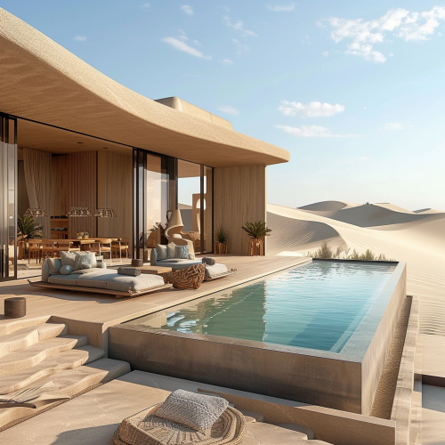 Design an expansive, ultra-luxurious outdoor leisure space for a billionaire's desert mansion, seamlessly integrating with the sleek and angular design of the house’s facade. The space is defined by clean, geometric lines and modern minimalism, using natural tones that blend with the surrounding desert landscape. The flooring is a mix of polished concrete and large natural stone slabs in warm, sandy hues, echoing the desert’s color palette. A stunning infinity-edge pool stretches across the main patio, with water flowing seamlessly over the edge, reflecting the orange and pink hues of the desert sunset. Around the pool, custom-built lounge beds with deep cushions in soft, neutral tones offer an inviting retreat. The furniture, including modern chaise lounges and sunbeds, is upholstered in high-end outdoor fabrics, with metallic accents in brushed bronze, giving a refined and timeless look. At night, the area transforms with integrated LED lighting, which highlights the architecture and the natural desert terrain. Discreet uplighting from the floor emphasizes the pool's sleek lines, while subtle, recessed lighting is integrated under the lounge furniture, creating a floating effect. A central firepit is carved into the stone flooring, surrounded by semi-circular, low-profile stone seating that mirrors the architectural forms of the house. The firepit glows with smooth black rocks, set against a backdrop of carefully curated desert plants, including large agave, aloe, and clusters of saguaro cacti, adding a touch of natural texture and color. To the side, an elegant outdoor kitchen is seamlessly integrated into the architecture, featuring custom cabinetry in dark wood and polished stone countertops. The kitchen includes a top-of-the-line grill, stone pizza oven, and [...]