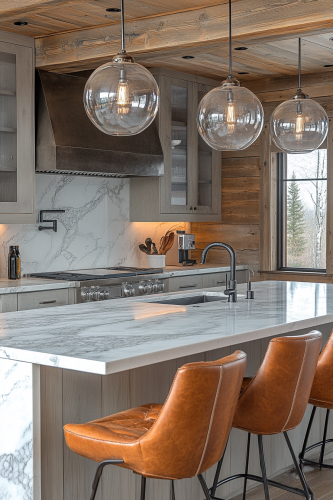 Design a luxurious small cabin interior kitchen with high-quality finishes like marble countertops, custom cabinetry, and designer lighting. Include luxury appliances and elegant seating to enhance the upscale feel. The decor should be refined and tasteful, with a focus on comfort and style. The kitchen should be immaculate, reflecting a high-end home's attention to detail. Photograph the kitchen to highlight its luxurious elements and compact elegance. Camera: DSLR - Canon EOS 5D Mark IV. Lens: Canon EF 24-70mm f/2.8L II USM. Composition: Wide shot, room-centered, horizontal orientation, balance between furniture and space. Film: Digital, high resolution, color profile sRGB. Camera settings: ISO 400, f/2.8, 1/60 sec. --ar 2:3 --v 6.1 --s 250