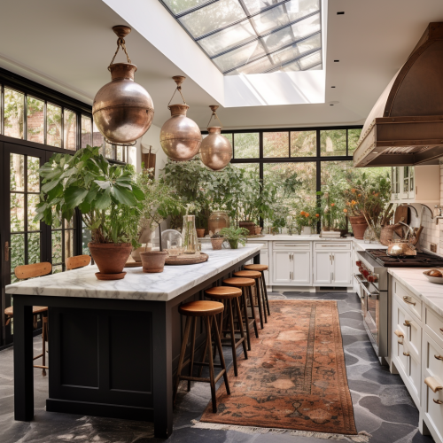 Design a grand, luxurious kitchen that reflects the mansion’s opulence while incorporating modern functionality. The kitchen should feature an expansive central island made of white Calacatta marble, with golden veining that harmonizes with the rich tones of the mansion's exterior. The marble countertop should have intricate, beveled edges, adding a sense of classical refinement. The island should have ample seating for casual dining, with plush velvet bar stools in a deep navy or emerald, accented with brass or gold legs to enhance the sense of luxury. The custom cabinetry is crafted from dark, rich walnut wood with detailed, inlaid paneling, and subtle gold handles, complementing the classical aesthetic. Upper cabinets feature glass doors with gold trimming, showcasing a collection of fine porcelain and crystalware, while concealed lighting adds a soft glow to highlight the textures. Beneath the island, the cabinetry includes a built-in wine fridge and additional storage space. Above the island, a row of three pendant lights hangs, each a masterpiece of blown glass and gold accents, providing warm lighting while maintaining an air of sophistication. The back wall of the kitchen features a double oven encased in a gold-trimmed, custom marble range hood, extending to the ceiling with ornate detailing. Surrounding the range, there is a stunning backsplash of white and gold marble, perfectly aligned with the tones of the island. The flooring is a seamless continuation of the polished marble found in the living room, carrying subtle gold and beige accents. The large, arched windows mirror the exterior, allowing natural light to flood the space and offer breathtaking views of the garden or terrace. Smart appliances are seamlessly integrated, blending into the [...]