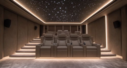 A photo of a large home cinema room with seating for ten people. LED lighting on the ceiling creates a starry effect. The floor is covered in grey carpet, and the walls are beige. Large wall panels with silver trim, and LED strip lights in a low-profile style along the bottom edge of the walls. --ar 128:69