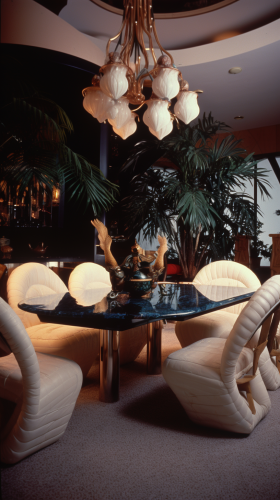 grainy wide angle photograph of a luxury 1980s makeup room area with funky furniture, unique use of space, with marble, in the style of 80s interiors, award winning photograph, colorized, sculpted, mafia boss, 1980s, soft moody lighting --ar 9:16 --style raw --s 50