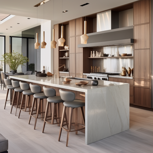 A L shape kitchenset with long kitchen island, large light yellow wall, luxury interior, minimalist style, side natural light, hyper realistic, wood and green complementary color --ar 16:9