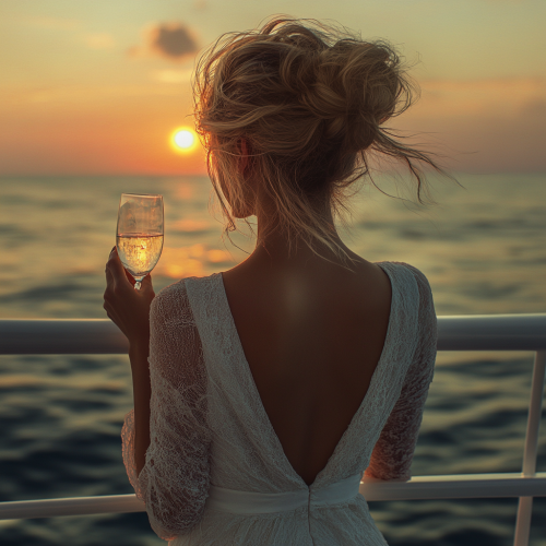 :a blond woman with a messy bun, dressed in a white dress is enjoying the sunset from a yacht holding a champaign glass. The woman is visible from behind, hyper realistic, cannon camera