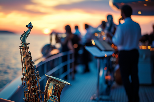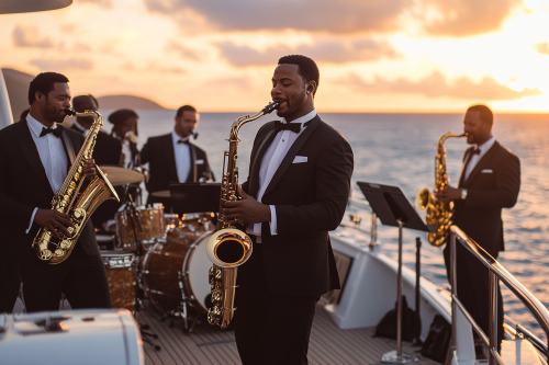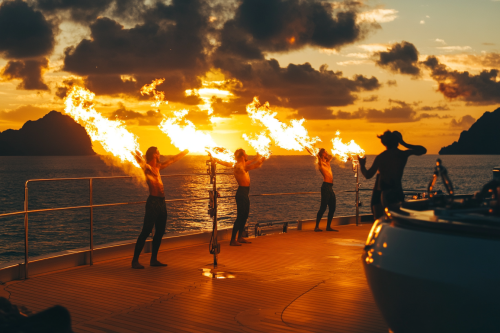 onboard entertainment on luxury yacht, fire performers illuminating the deck, tropical island backdrop, golden hour light, festive atmosphere --v 6.1 --ar 3:2