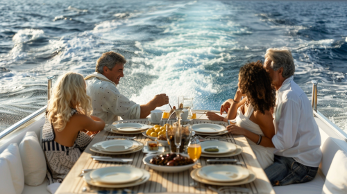 /family on the aft deck of a luxury motor yacht, luxury yacht charter --v 6.0 --ar 16:9