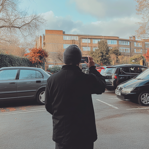 Amateur photo of the back of a man standing in front of a car in a parking lot in London, and taking a photo of the reg plate, back view of the man, natural light, amateur picture posted on Instagram Stories, taken with iphone 10