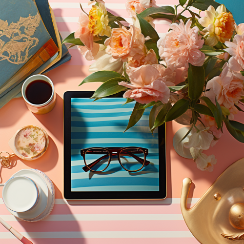 a photorealist image looking directly down on a desk with an ipad centered , luxury, high end, a vase of exotic flowers, stripe, gucci glasses, wes anderson style teals, pink with gold hasselbad