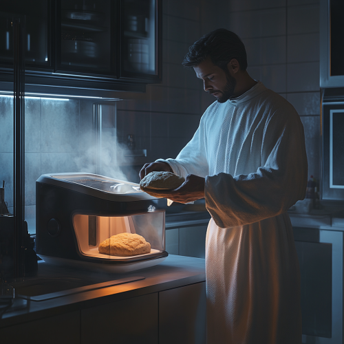 A realistic photo of a 40 years old male in his kitchen in nightrobe, using a futuristic countertop bread machine that looks a slightly bigger nespresso machine. We can see the male putting a frozen bread dough in the machine.