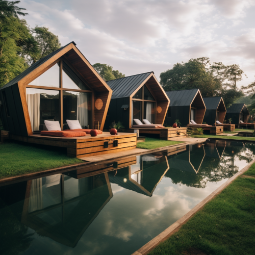 house exterior design in the forest, black and brown structure with glass walls, modern style, natural light from skylights, luxury materials, wooden accents, large garden with big pool--water turquoise and clear water-- steps of schei stairs leading to the entrance of the house, plants, flowers, outdoor street lamps, natural lighting, sunlight through trees, natural atmosphere, modern design, natural materials, warm ambiance, modern interior design --ar 99:128