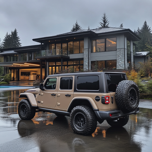 2024 Jeep Wrangler Unlimited, oversized off-road tires, suspension lift, flat tan Flat Dark Earth color, in front of my big shop in my back part of my property, Rear of house visible, swimming pool, 3 story house from rear, lots of glass windows, dark skies, wet ground to catch reflections, subtle, upscale ,mansion style home in my Seattle neighborhood