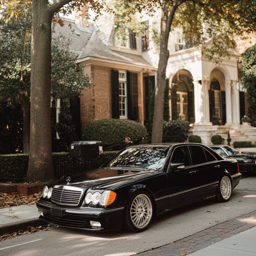 a 2025 mercedes e200 black with a mansion in the background. Shot with a Nikon AF-S DX Nikkor 35mm f/1.8g lens, lit by daylight, photo --v 6.0 --style raw --p 3bu4zsk