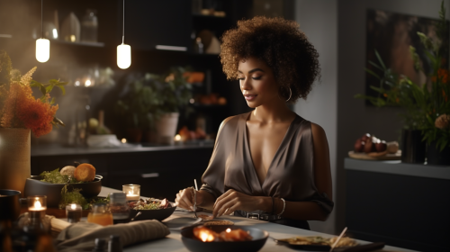 black woman with afro in high fashion 2023 attire cooking in a luxury kitchen that has organic minimalist interior design. White Brizo Kitchen Faucet. Dim lighting. Photo realistic. 8K. --style raw --s 250 --ar 16:9