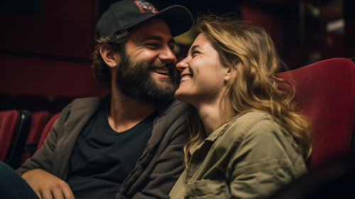 a very detailed image of a happy couple at a movie theatre, taken with a canon eos5 50mm f2.5 lens --ar 16:9
