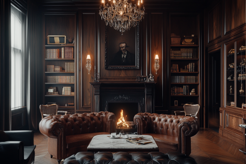 Luxurious apartment interior, characterized by rich, dark wood paneling, soft leather furnishings, a grand chandelier above, marble-topped surfaces, and minimalist yet elegant decor, creating a sophisticated and warm atmosphere. Photorealistic, highly detailed, 8K resolution --ar 3:2 --v 6.1 --style raw