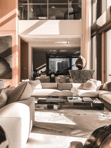 Luxury real estate downtown penthouse apartment interior photograph cinematic evening, blue early evening outside --v 6.0
