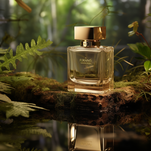 expensive luxury perfume, gold rectangle with jungle backdrop, ultra realistic, f.18, 80mm lens, 8k --s 250