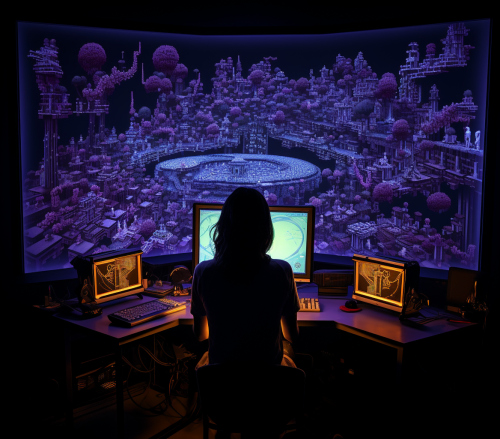 Female Gamer in the dark playing Terraria, directed by Ingmar Bergman, cinematic views in the style of Dan Clowes, etched contour lines on acrylic data bending by susan kare --ar 279:246