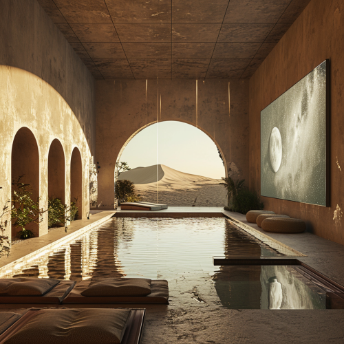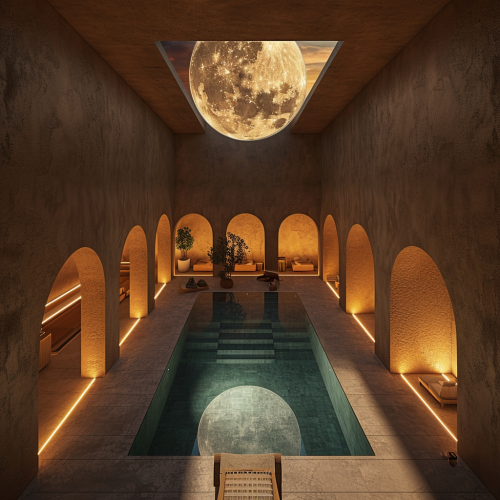 aerial view 3d schematic of luxury spa, ultra minimal, rentagular pool, arches one wall is entirely a video wall of morrocan desert at night with massive moon on the screen --v 6.0