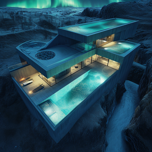 aerial view 3d schematic of luxury spa, ultra minimal, featuring 4 small rentagular pools, walls have projection map of iceland at night with aurora borealis --v 6.0