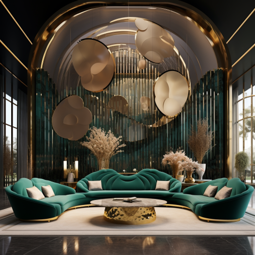 Craft a sophisticated scene of the front desk and lobby in a fancy hotel resort, with workers wearing black suits. Emphasize the luxury and upscale atmosphere of the reception area. (5 descriptive keywords) Sophisticated scene, front desk, lobby, fancy hotel resort, workers in black suits. (Camera types) Illustration. (Camera lens type) Grand perspective. (Time of day) Evening ambiance. (Style of Photograph) Upscale resort reception. (Type of film) Luxury escape.