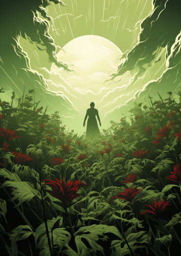 close up of an array of plants in the style of zdzisław beksiński, hyperrealistic, botanic, camera on groundlelvel, enigmatic tropics, very detailed foliage, primitive forms --ar 128:71