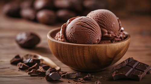 realistic photo of a chocolate ice cream in a wooden bowl on a wooden table. On the table there are some cocoa beans and some broken chocolate. The photo is in dim light and must convey a sense of craftsmanship --ar 16:9