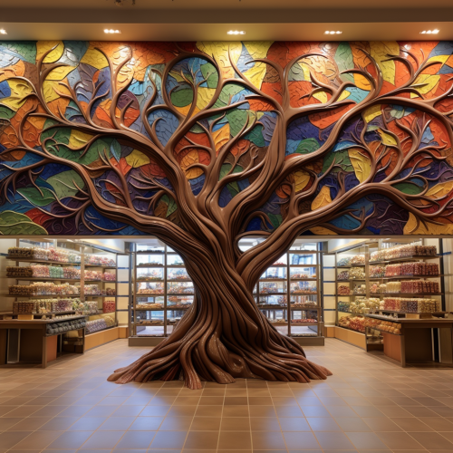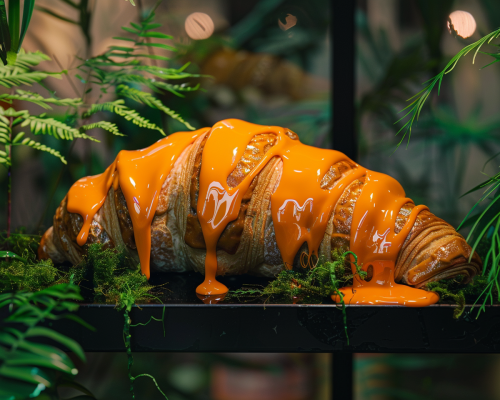 croissant with orange paint layer dripping off of it, as a plastic decoration on a shelf of a coffee shop, greenery growing from it, product design, interior design, realistic --ar 5:4 --v 6.0