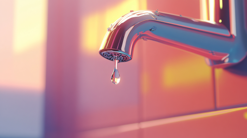 A close-up, detailed cartoon-style illustration of a water faucet with a small leak, captured from a low angle looking up at the faucet. A single droplet of water is seen forming and dripping from the end of the faucet, emphasizing the waste caused by the leak. The background is slightly blurred to keep focus on the dripping faucet, with bright colors to make the image visually engaging and suitable for educational purposes for kids. --ar 16:9