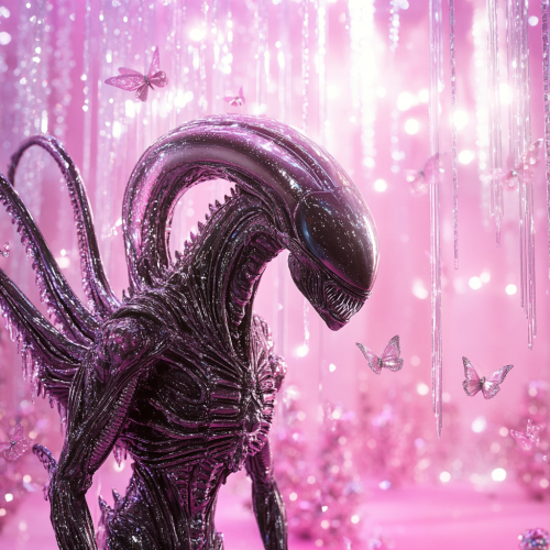 hyper realistic Xenomorph photoshoot in a pink sparkly room, with crystals and diamonds dripping from the ceiling above. there are pink and white sparkling butterflies flying around