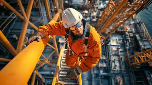 oil rig worker on looking at camera isolated: place worker in the middle of image should be visible whole figure, worker should crounch down, with working tools, doing his job, 3d high quallity, high detail. dynamic perspective from bottom --ar 16:9