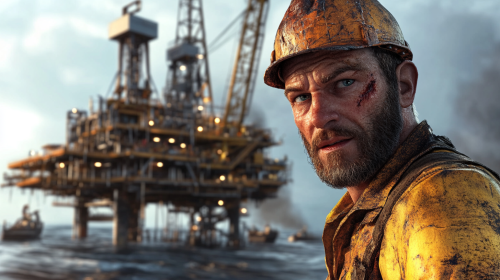 game cover with oil rig worker in the middle looking at camera and oil rig in background, 3D art, high detailed, realistic, central composition, --ar 16:9