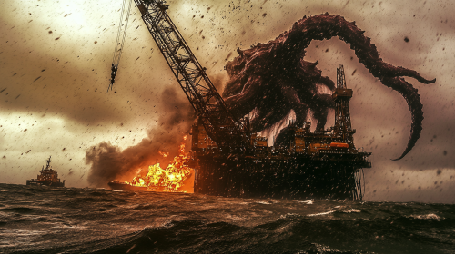 realistic photo of cthulu destroying an oil rig off the coast of scotland, stormy weather, early afternoon, using a high definition camera (even with water on the lens), Cthulu eldritch horror slamming on the oil rig with fire and smoke in the background. Scary and surreal, indistinguishable from real life, this can't be happening, ultra high definition --ar 16:9 --v 6.1