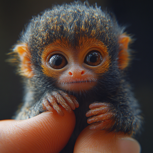 Generate a highly realistic video clip depicting a pygmy marmoset monkey, clinching with the human finger Incorporate subtle textures, shading, and lighting to enhance realism. Ensure the video is smooth, with no visible artifacts or glitches, and is rendered in a high-definition resolution. --s 750