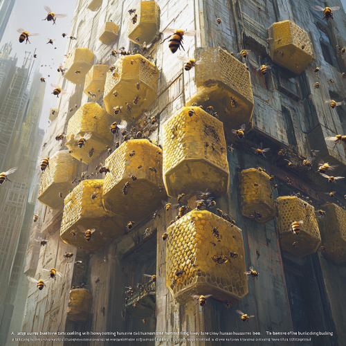 "A large, surreal beehive attached to a towering building, with honeycomb cells housing tiny human figures working like bees. The beehive blends into the structure of the building, symbolizing a dystopian world. The city’s citizens have transformed into bees, flying around and interacting with the hive. The entire scene is inverted, with the sky below and the ground above, adding to the surreal atmosphere. The color palette is a mix of muted industrial tones and golden hues from the hive. The overall mood is both fantastical and eerie, blending urban life with nature."