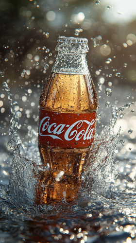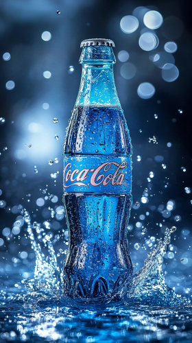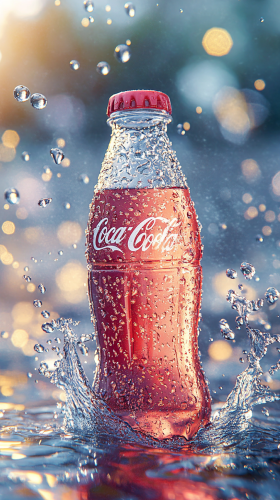 Product photography, a product shot of a pale a Coca-Cola bottle on water, sparkling bubbles, sparkling water droplets splashing, soft dreamy simple backgrounds, dreamy atmospheres, close-ups, studio lighting, high resolution photography style, super detail, super realistic rendering and super sharp detail, --ar 9:16 --style raw --v 6.1 --s 250