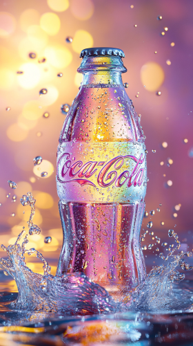 Product photography, a product shot of a pale a rainbow color Coca-Cola bottle on water, sparkling bubbles, sparkling water droplets splashing, soft dreamy simple backgrounds, dreamy atmospheres, close-ups, studio lighting, high resolution photography style, super detail, super realistic rendering and super sharp detail, --ar 9:16 --style raw --v 6.1 --s 250