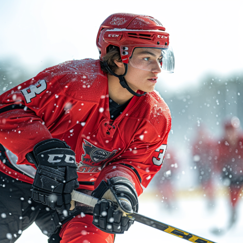 A german male 16 year old hockey player is playing field hockey, professional spots fotograf, no edit, natural colors, winning emotions --ar 4:5